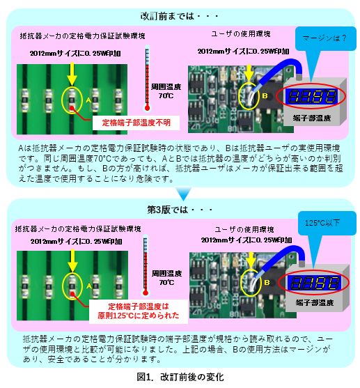 器の使用温度の基準を周囲空間の温度から抵抗器の端子部(フィレット中央)に変更する」考え方です。