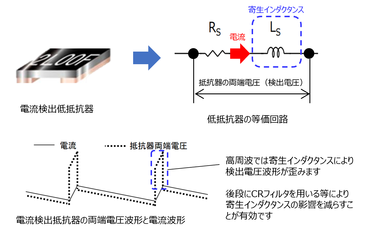 電流検出抵抗器による電流の測定は、「抵抗器の両端に生じる電位差と抵抗器を通過する電流が比例する」関係を用いますが、高周波数帯では寄生インダクタンスの影響でこの関係が成り立ちません。高周波数帯で正確に電流を測定する為には、CRフィルタを用いる等の、寄生インダクタンスの影響を減らす事が有効です。