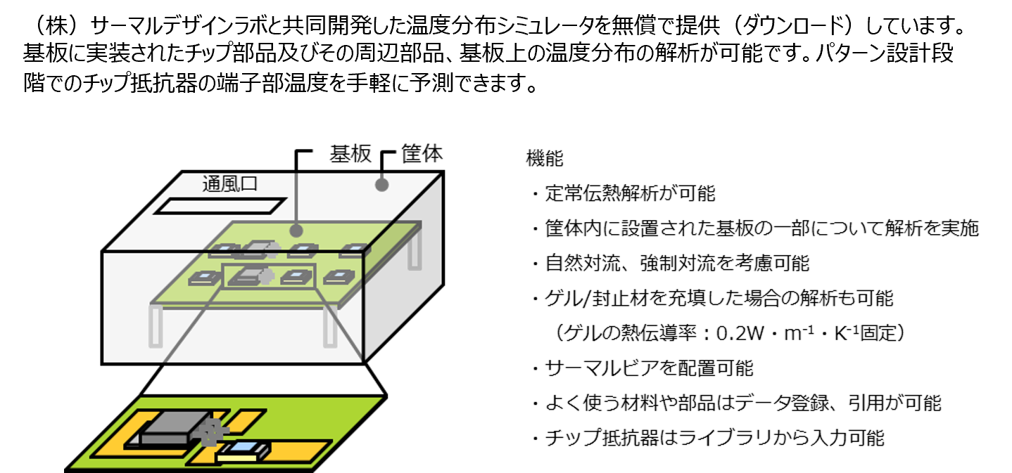 電子機器の小型、高信頼化に伴い、電子部品や基板の局部温度上昇を抑えることの重要性が高まっています。高発熱部品では初期設計段階に温度上昇を予測、対策することが一般化してきました。一方、基板に搭載される数量が多い小型チップ部品では同様の手法を用いることが難しく、試作後に部品密集などによる熱問題が発覚することがまだあります。本資料では、熱抵抗を指標とした放熱設計の基本的な考え方と、当社製無料温度分布シミュレータを用いた小型電子部品温度の簡便な予測手法を解説します。