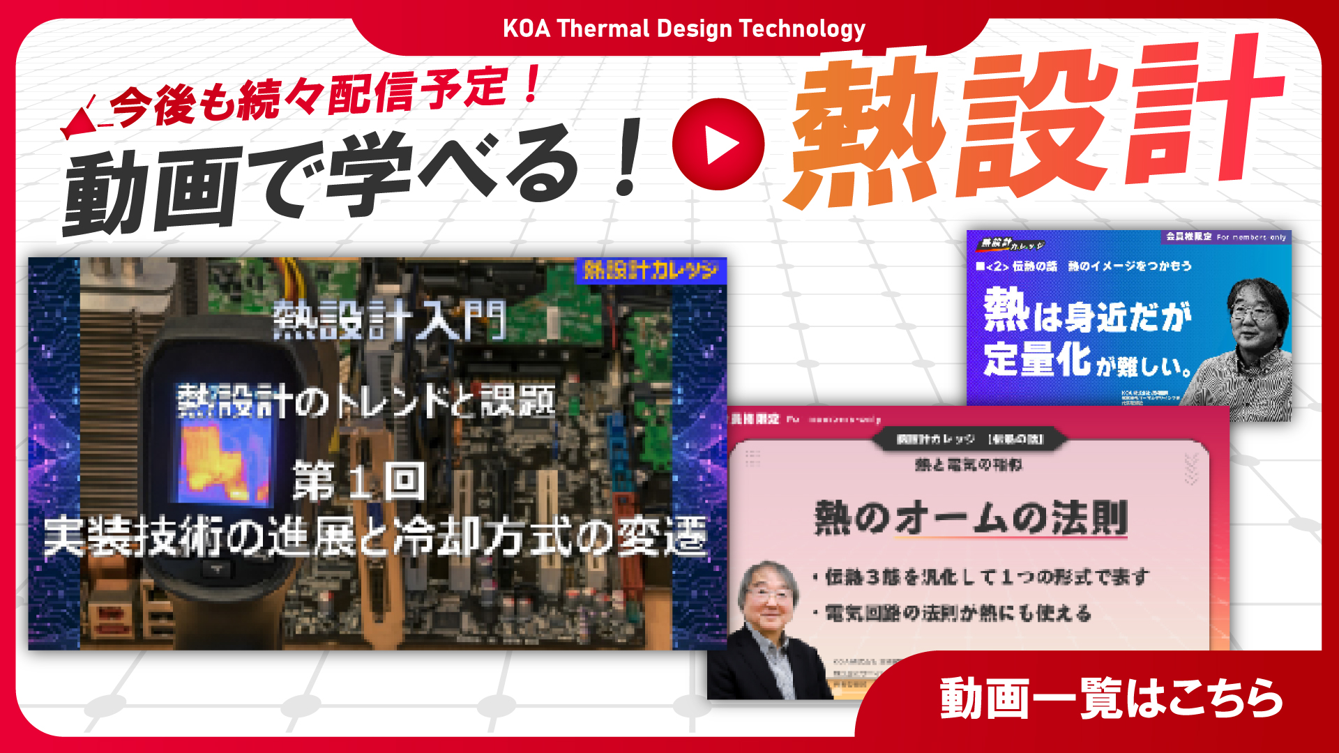 電子機器の小型化や高密度実装化による電力密度の増大により、熱設計の重要性が高まっています。 KOAでは電子機器の設計者、回路設計者向けに熱設計に関する情報を幅広くテーマごとに提供しております。 ご興味のある内容・必要なデータ類をご活用ください。
