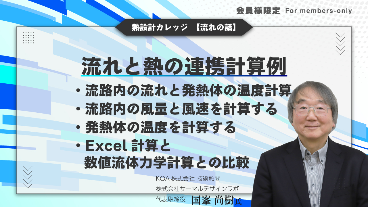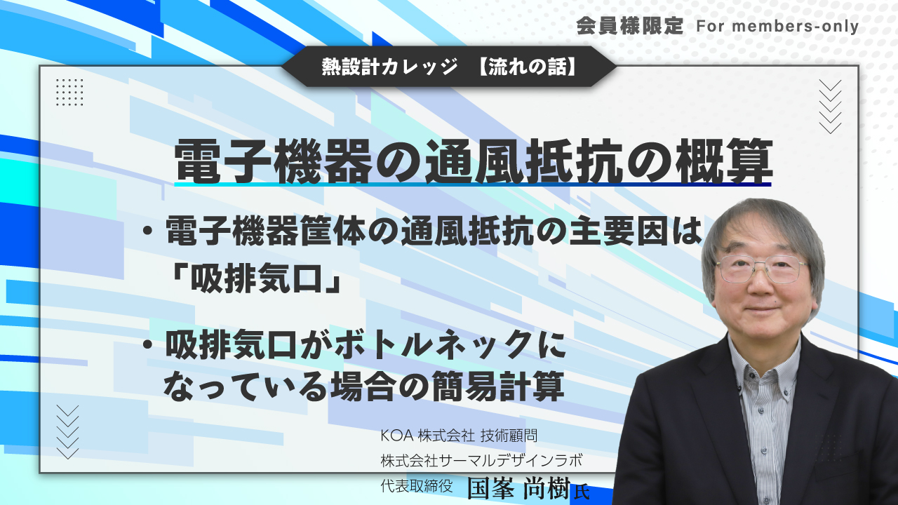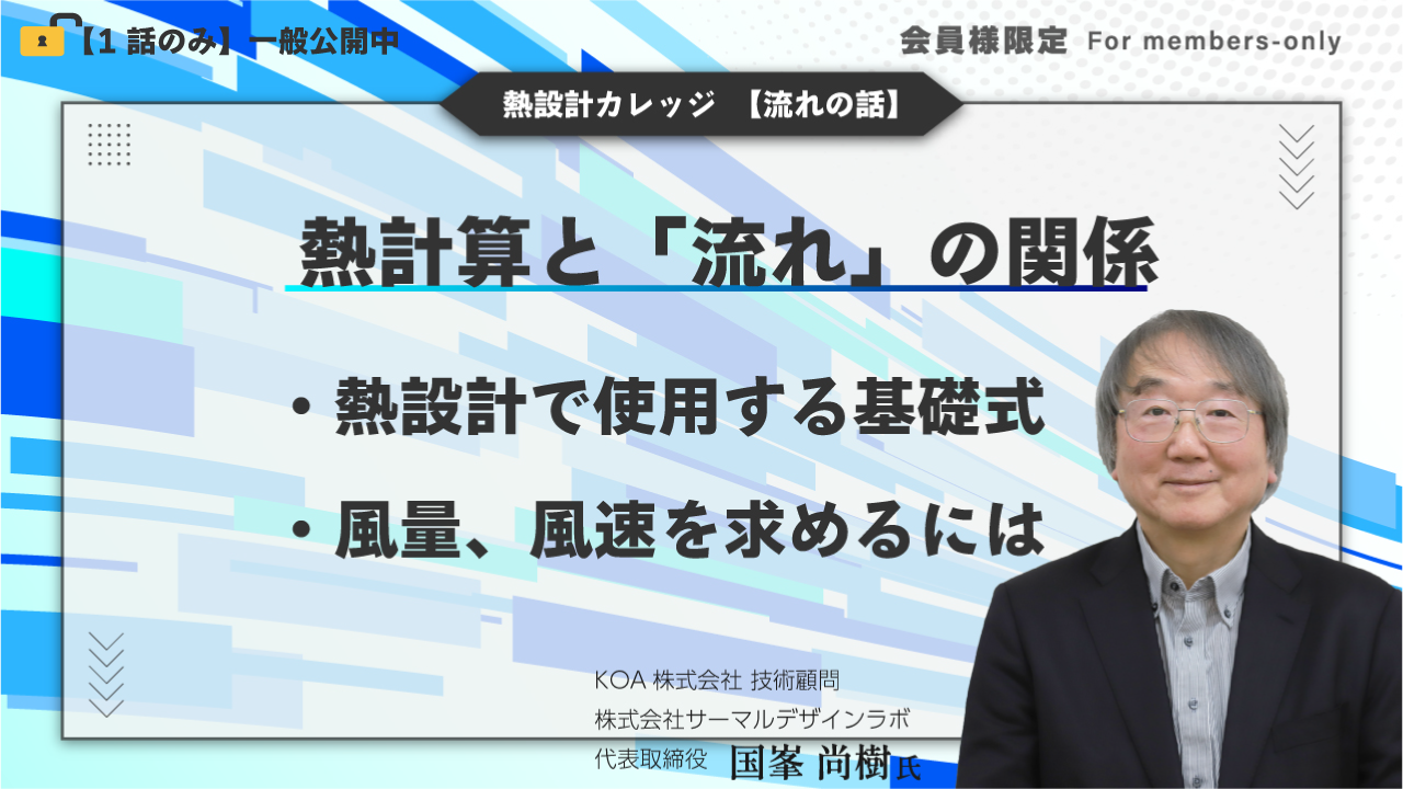 電子機器の多くが熱を空気に載せて運ぶメカニズムを採用しており、「空気(冷媒)がどのように動くか」を知ることが重要になっています。熱計算では熱伝達率を求めるときに「風速」を使います。また換気放熱の算出に「風量」が必要になります。つまり熱計算を完結するには風速と風量がわからなければなりません。これらはファンの特性や装置の通風抵抗で決定されるため、流れ計算の基本を押さえておく必要があります。