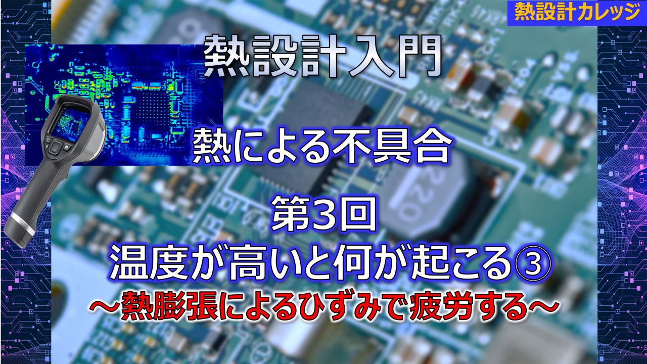 熱による不具合の中でも特に多い不具合が熱膨張差による機械的なひずみでの熱疲労です。 繰り返しのひずみによりクラックが入り、そこから破壊に至るなど、さまざまな問題を引き起こします。 本動画ではひずみによる熱疲労の説明及びその評価試験について解説します。