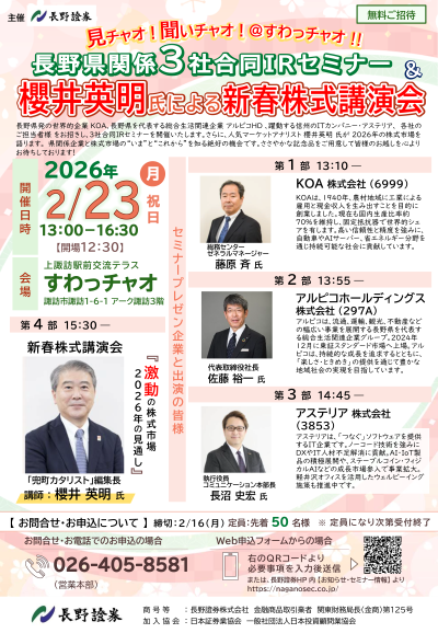 KOAは、2月23日(月・祝)に開催される長野證券株式会社様主催の「長野県関係3社合同IRセミナー&櫻井英明氏による新春株式講演会」に参加いたします。