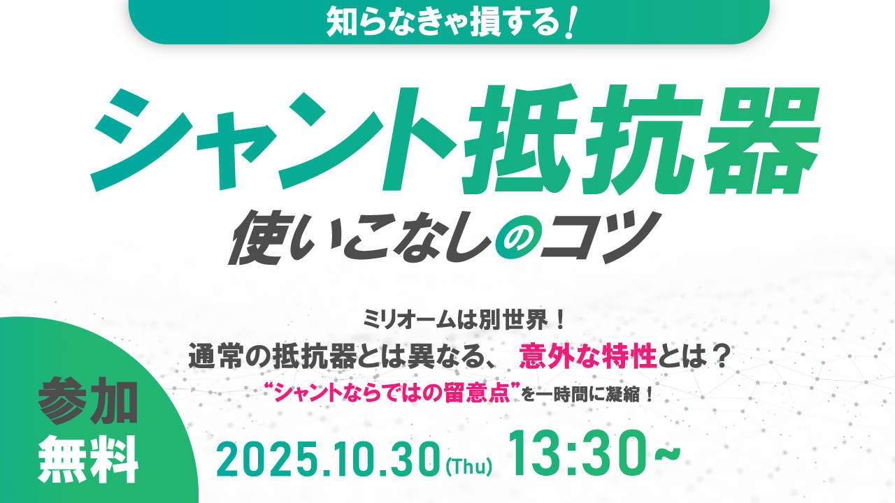 シャント抵抗器を初めて使用する方にお勧めのセミナーです。シャント抵抗器は抵抗値が極端に低いために、あるいは抵抗体が金属であるために、通常の抵抗器とは異なる意外な性質を持っています。高い周波数の電流を検出したいとき、高精度で使いたいとき、熱設計をするときなど、シャントならではの留意点を1時間に濃縮してお伝えします。 |